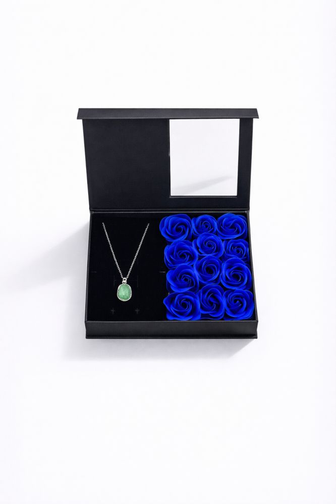 - تنسيق الورد الأزرق: الصندوق يحتوي على 12 وردة مخملية باللون الأزرق النيلي العميق، ليعكس تباينًا لونيًا مذهلاً مع الحجر الأخضر.