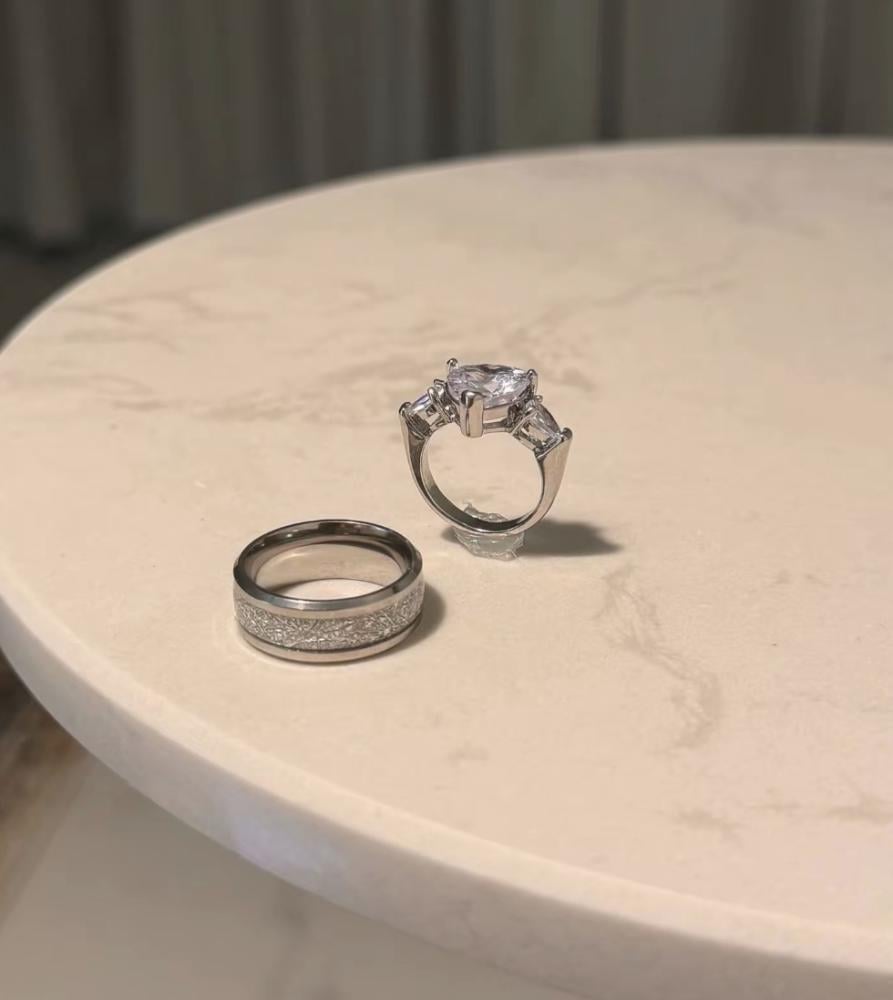 بعيداً عن التصاميم التقليدية المكررة، صُمم هذا الطقم المزدوج ليُعبّر عن الارتباط بلغة حديثة. خاتم بتفاصيل صلبة ومطفية، يقابله خاتم بتصميم كريستالي دقيق. تباين مثالي يكتمل بسرّ واحد: عبارة مخفية محفورة بالداخل، لا يقرؤها أحد غيركما.