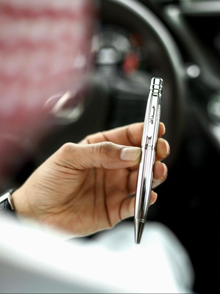 قلم حبر مع الاسم بتصميم فني بأي لغة حسب الطلب بجودة عالية وتوصيل سريع . قلم كتابة متوفر بطلاء ذهبي أو فضي مريح لليد. من بريق أجمل أقلام هدايا رجالية